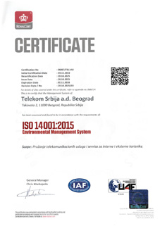 Ovim sertifikatom potvrđuje se da je Telekom Srbija a.d. Beograd implementirala i održava sistem menadžmenta informacijama